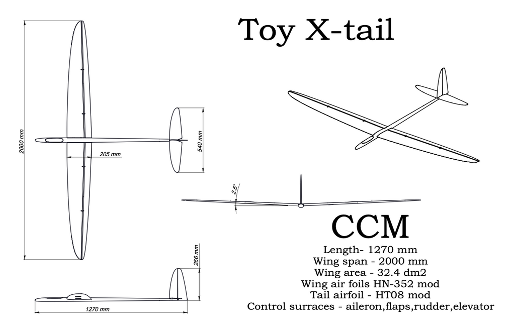 New for 2019 from CCM in Ukraine. The Toy 2m can slope, thermal, race, or just sport fly!  Available in two versions, spread tow (light) and standard carbon (hard). The spread tow version is lighter and suitable for light to medium slope lift. Swap out the 5 degree wing joiner for the 10 degree joiner and go hunt down some thermals!
